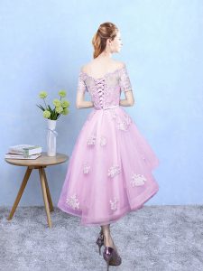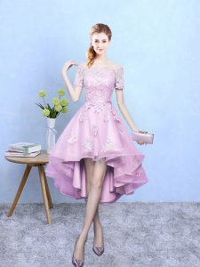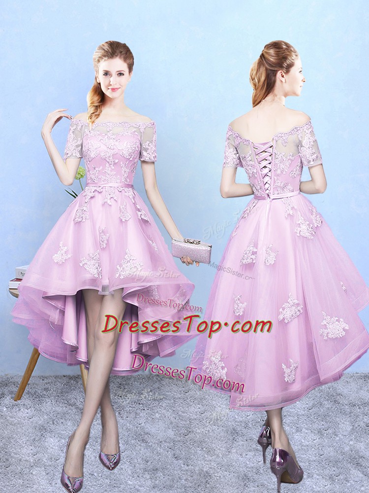 Off The Shoulder Short Sleeves Vestidos de Damas High Low Lace Rose Pink Tulle