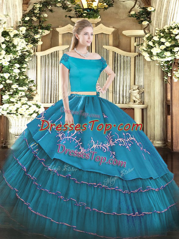 Off The Shoulder Short Sleeves Zipper Sweet 16 Quinceanera Dress Teal Organza and Taffeta