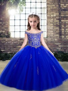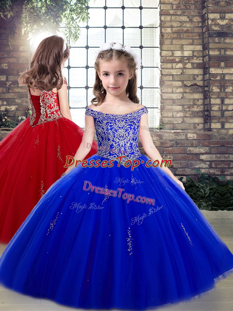 Off The Shoulder Sleeveless Lace Up High School Pageant Dress Royal Blue Tulle