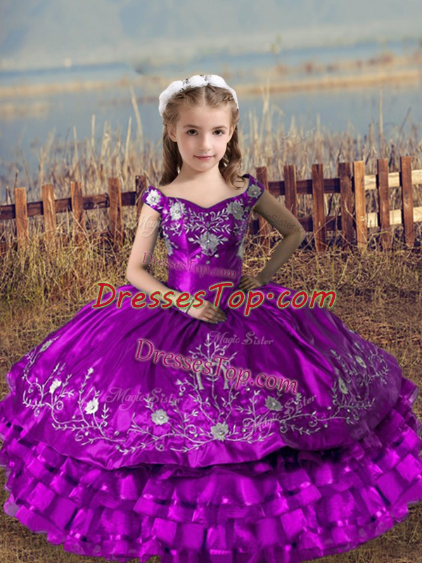 Off The Shoulder Sleeveless Lace Up Kids Pageant Dress Purple Satin and Organza