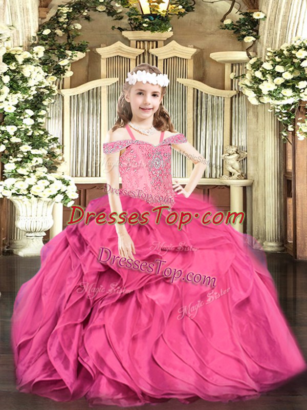 Off The Shoulder Sleeveless Lace Up Pageant Dress for Girls Hot Pink Organza