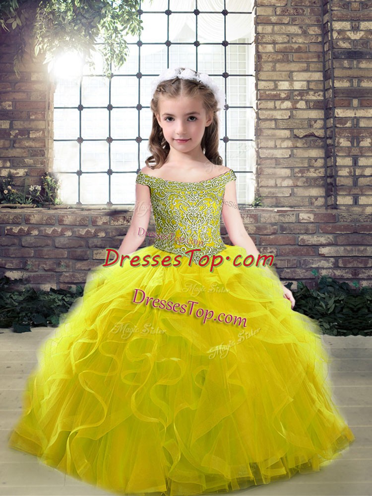 Off The Shoulder Sleeveless Lace Up Pageant Dress Toddler Olive Green Tulle