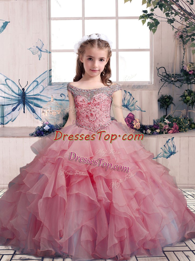 Off The Shoulder Sleeveless Little Girl Pageant Dress Floor Length Beading and Ruffles Pink Organza