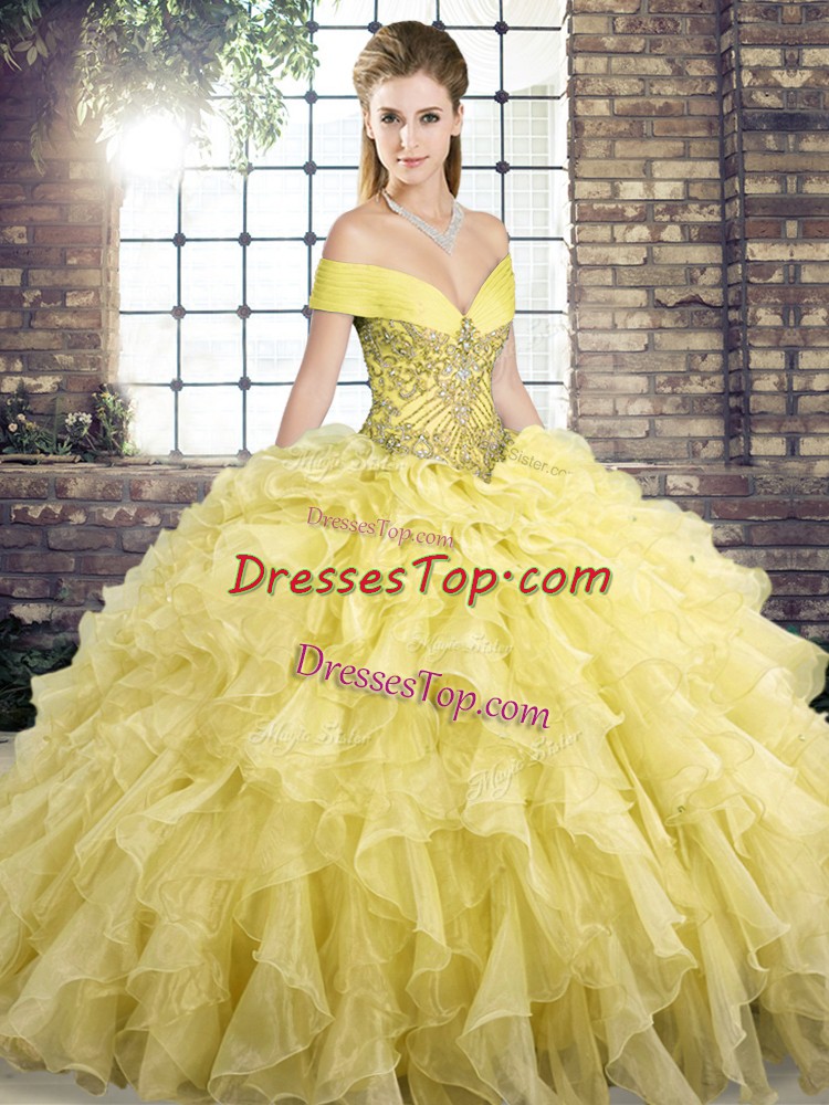 Off The Shoulder Sleeveless Organza Sweet 16 Quinceanera Dress Beading and Ruffles Brush Train Lace Up
