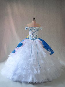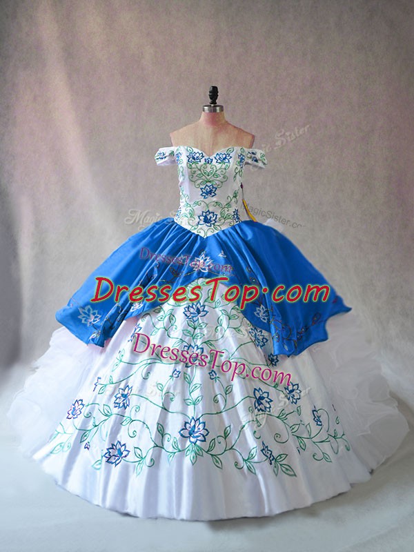 Off The Shoulder Sleeveless Quince Ball Gowns Floor Length Embroidery and Ruffles Blue And White Organza