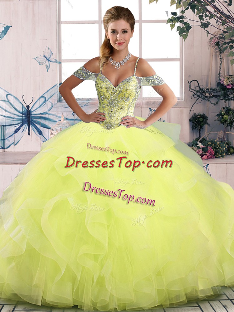 Off The Shoulder Sleeveless Side Zipper Quinceanera Dress Yellow Green Tulle