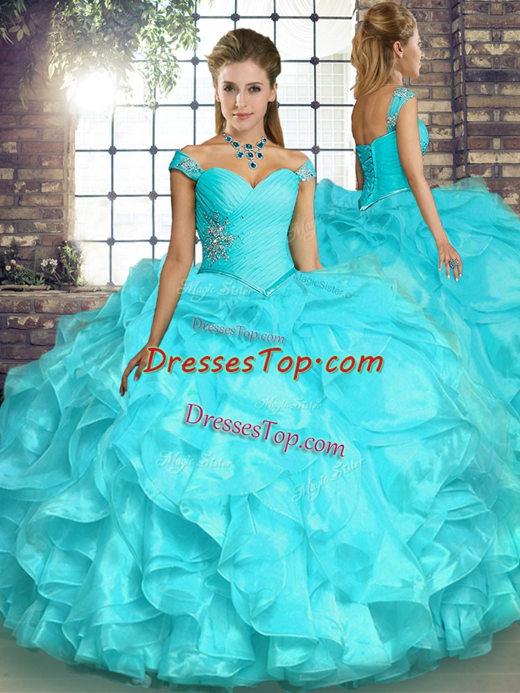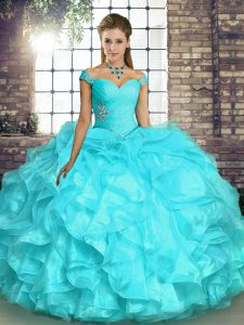 Off The Shoulder Sleeveless Sweet 16 Quinceanera Dress Floor Length Beading and Ruffles Aqua Blue Organza