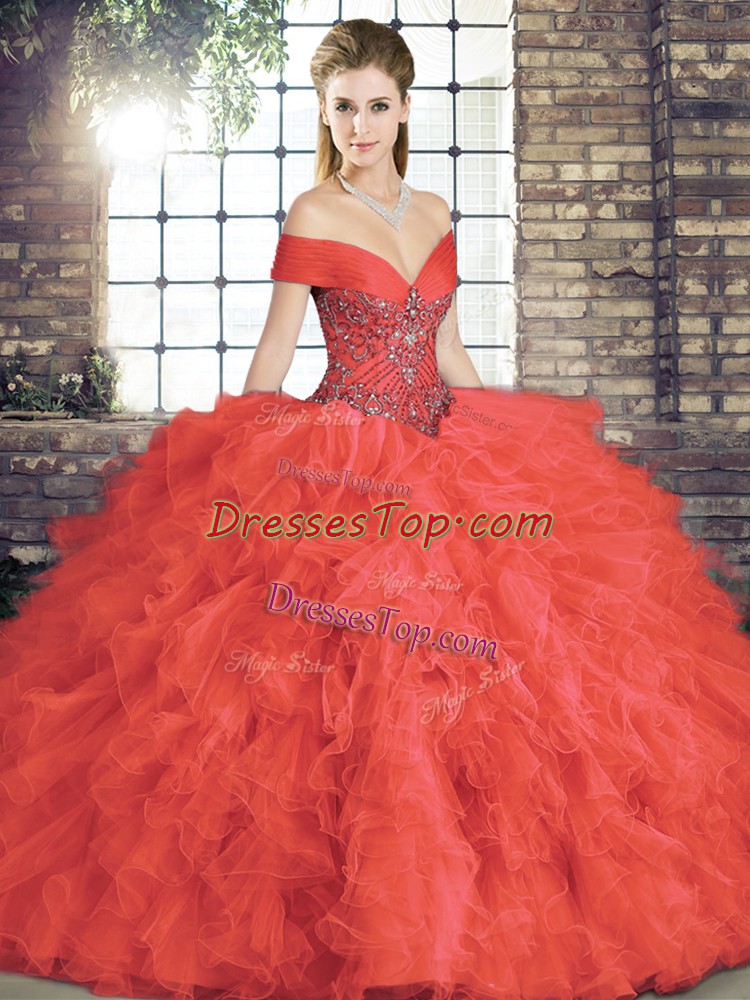 Off The Shoulder Sleeveless Tulle Quinceanera Dresses Beading and Ruffles Lace Up