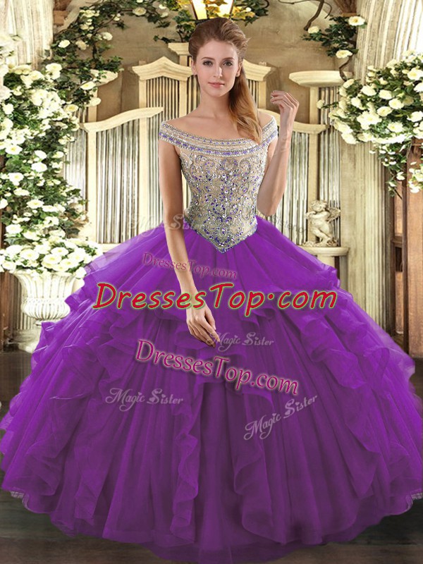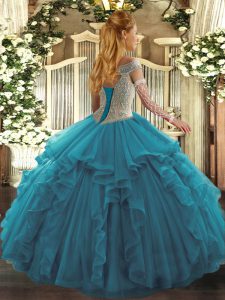 Off The Shoulder Sleeveless Tulle Sweet 16 Dresses Beading and Ruffles Lace Up