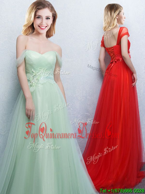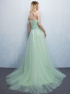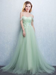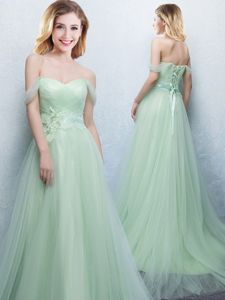 Off the Shoulder Sleeveless Tulle With Brush Train Lace Up Court Dresses for Sweet 16 in Apple Green for with Appliques and Ruching