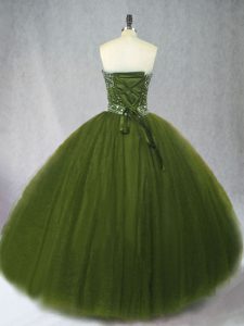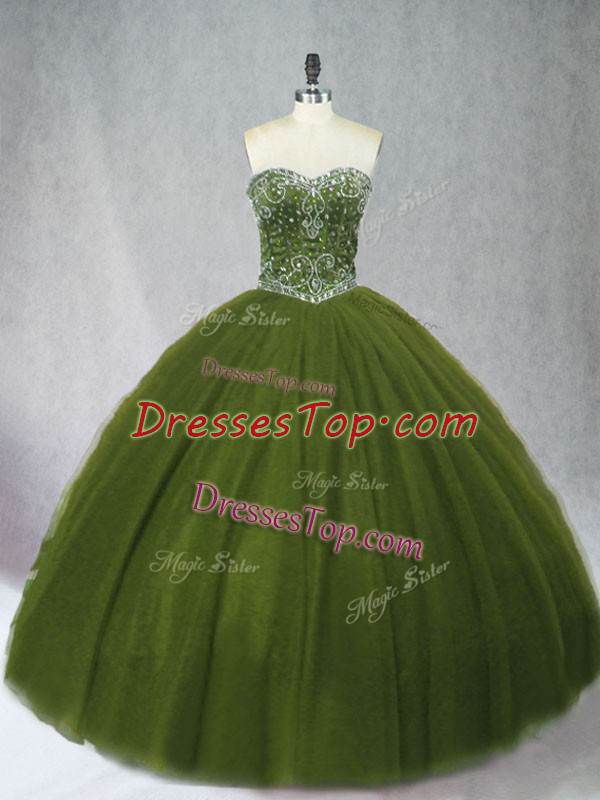 Olive Green Ball Gowns Beading 15 Quinceanera Dress Lace Up Tulle Sleeveless Floor Length