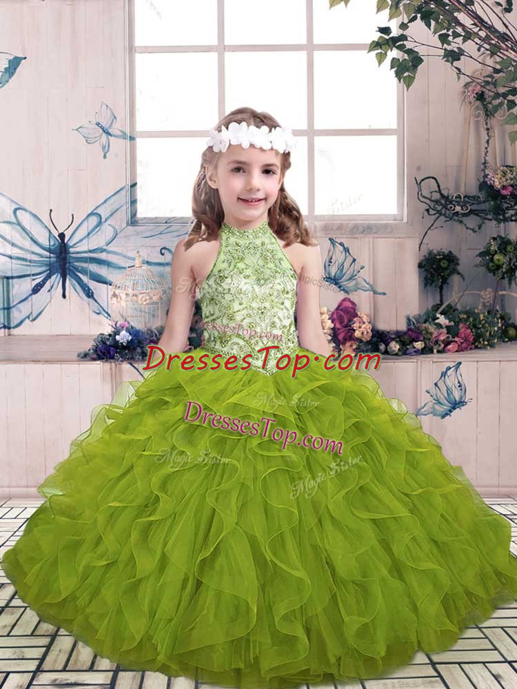 Olive Green Ball Gowns Beading and Ruffles Girls Pageant Dresses Lace Up Tulle Sleeveless Floor Length