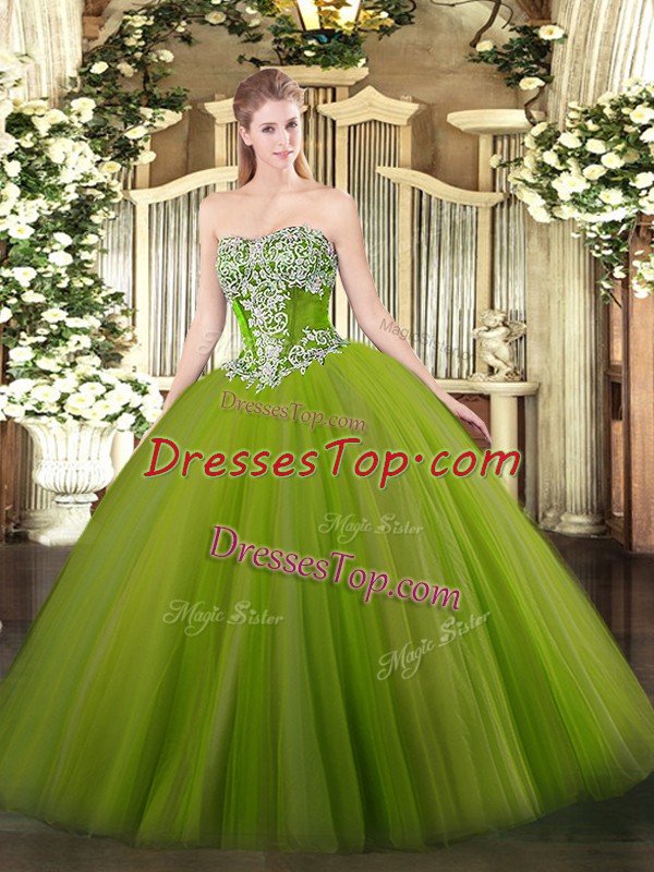 Olive Green Ball Gowns Tulle Strapless Sleeveless Beading Floor Length Lace Up Sweet 16 Quinceanera Dress