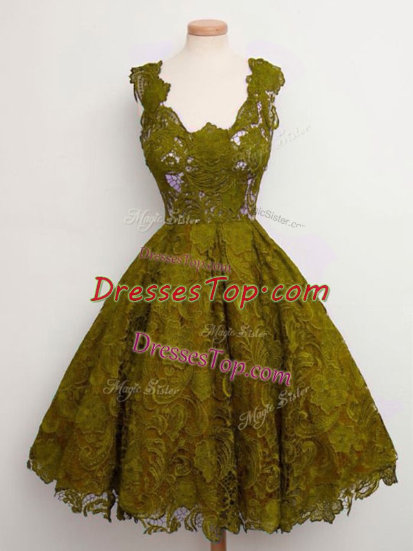 Olive Green Lace Lace Up Straps Sleeveless Knee Length Dama Dress for Quinceanera Lace