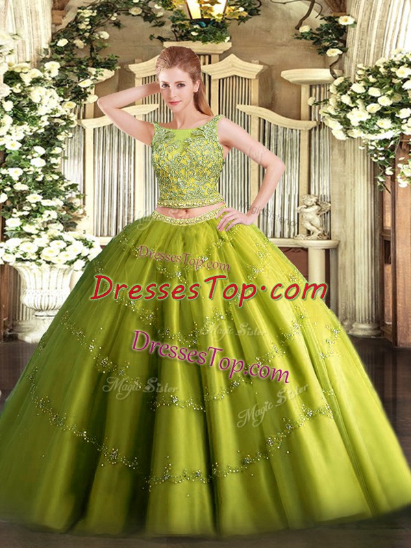 Olive Green Lace Up Scoop Beading and Appliques Quinceanera Gowns Tulle Sleeveless