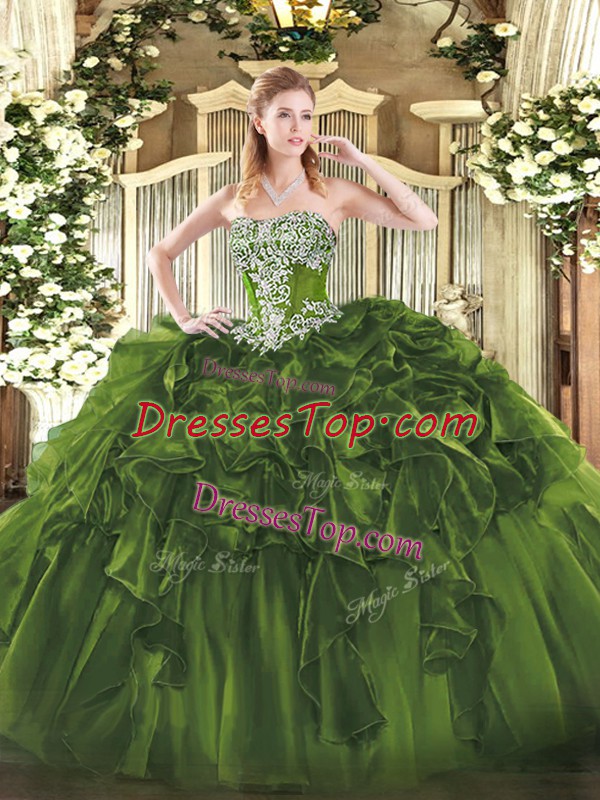 Olive Green Lace Up Strapless Beading and Ruffles Quinceanera Dresses Organza Sleeveless