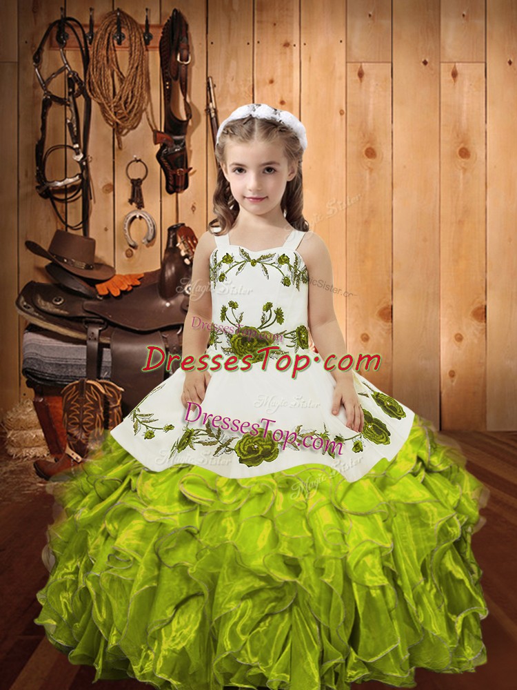 Olive Green Lace Up Straps Embroidery and Ruffles Little Girls Pageant Dress Wholesale Organza Sleeveless