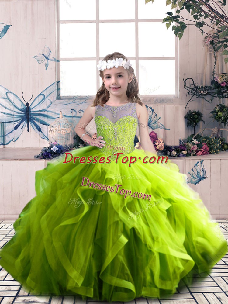 Olive Green Scoop Neckline Beading and Ruffles Child Pageant Dress Sleeveless Lace Up