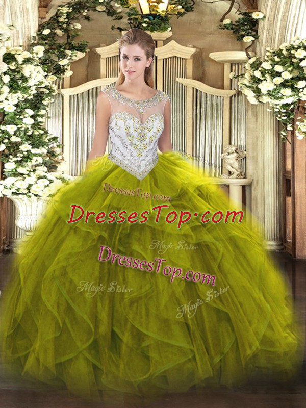 Olive Green Sleeveless Floor Length Beading and Ruffles Zipper 15th Birthday Dress
