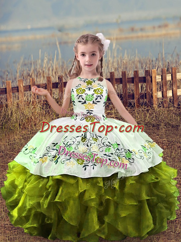 Olive Green Sleeveless Floor Length Embroidery and Ruffles Lace Up Kids Pageant Dress