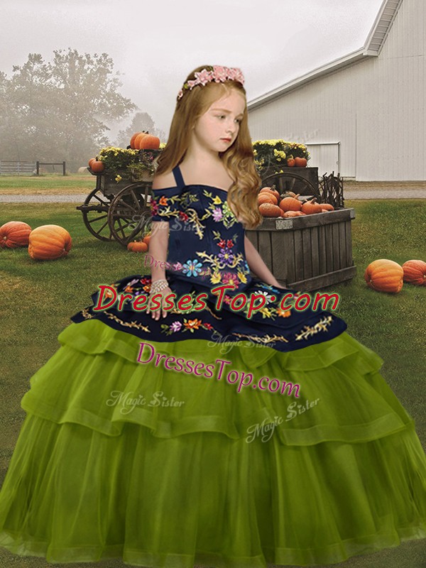 Olive Green Sleeveless Floor Length Embroidery Lace Up Little Girl Pageant Gowns