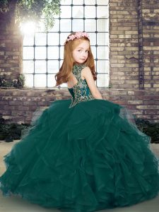 Olive Green Tulle Lace Up Pageant Gowns For Girls Sleeveless Floor Length Beading and Ruffles