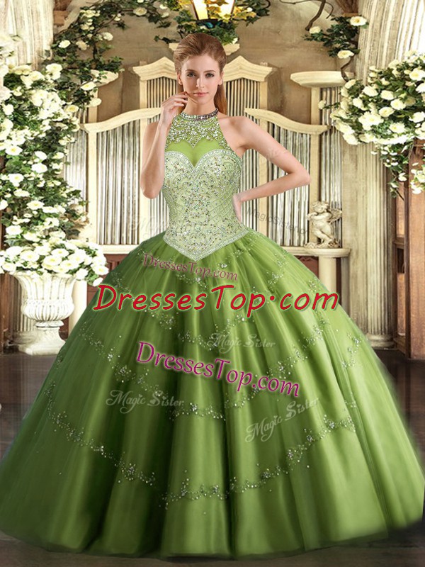 Olive Green Tulle Lace Up Quinceanera Dresses Sleeveless Floor Length Beading and Appliques