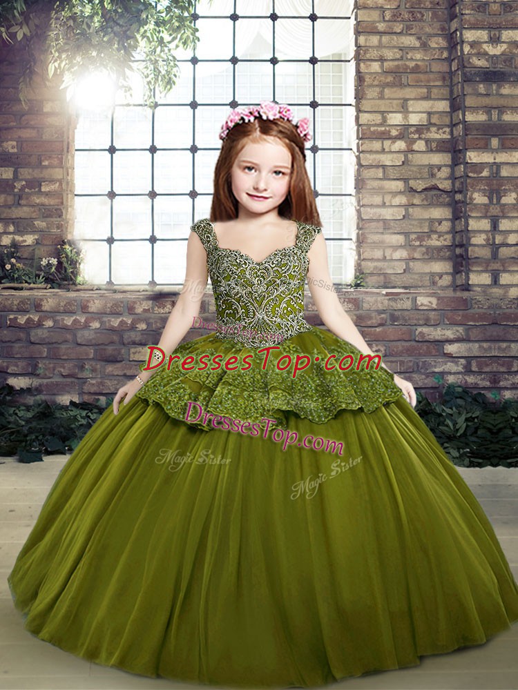 Olive Green Tulle Straps Sleeveless Beading Floor Length Lace Up Kids Formal Wear