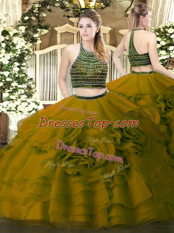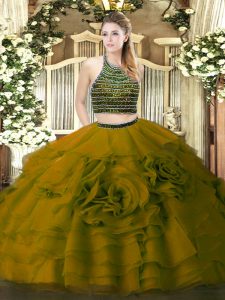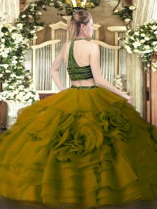 Olive Green Tulle Zipper Halter Top Sleeveless Floor Length Sweet 16 Dresses Beading and Ruffled Layers