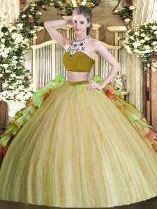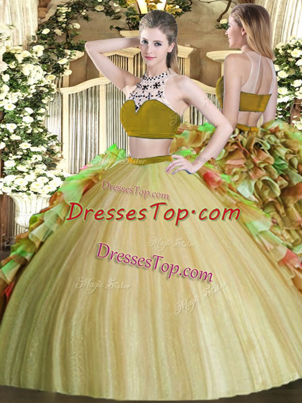 Olive Green Two Pieces Beading and Ruffles Ball Gown Prom Dress Backless Tulle Sleeveless Floor Length