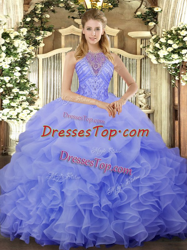 On Sale Beading and Ruffles and Pick Ups Ball Gown Prom Dress Blue Lace Up Sleeveless Floor Length