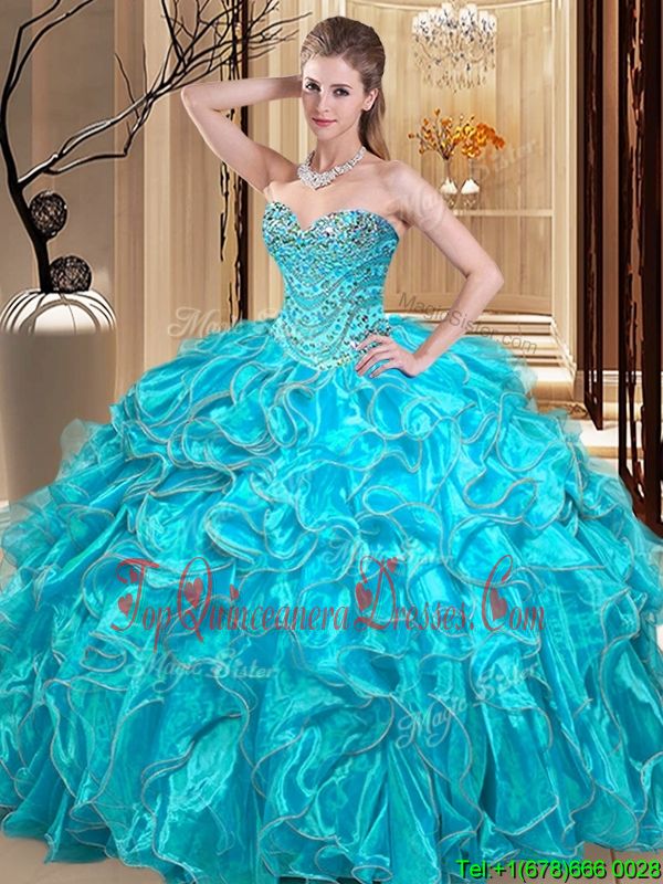 On Sale Floor Length Lace Up Quince Ball Gowns Aqua Blue and In for Military Ball and Sweet 16 and Quinceanera with Beading and Ruffles