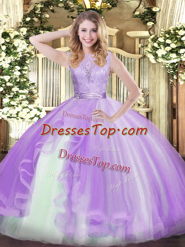 On Sale Lavender Sleeveless Floor Length Lace and Ruffles Backless Quinceanera Gowns