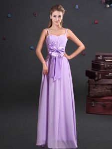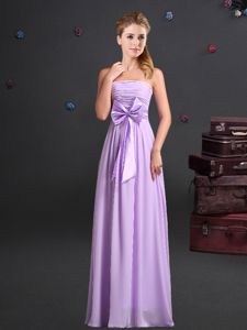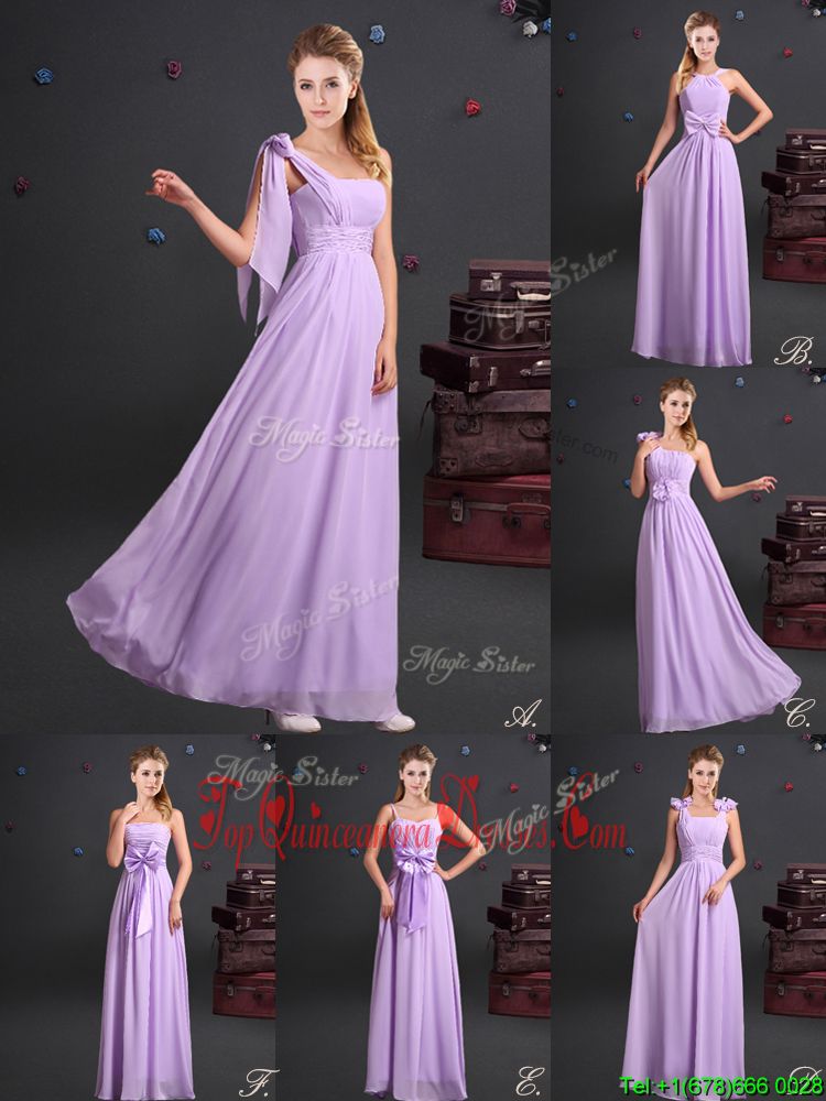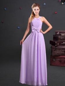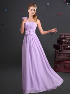 On Sale One Shoulder Chiffon Sleeveless Floor Length Dama Dress for Quinceanera and Ruching and Bowknot and Hand Made Flower