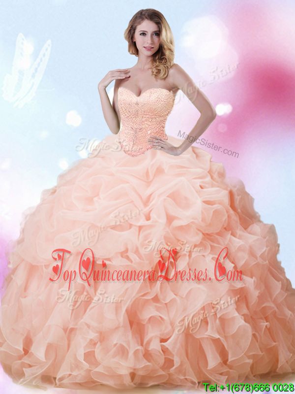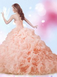 On Sale Organza Sweetheart Sleeveless Brush Train Lace Up Beading and Ruffles and Pick Ups Quince Ball Gowns in Peach