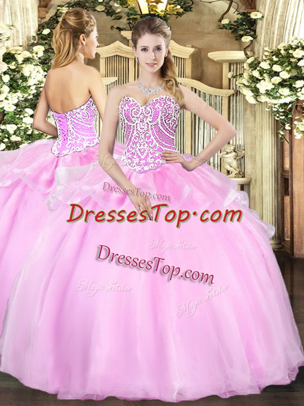 On Sale Pink Ball Gowns Sweetheart Sleeveless Organza Floor Length Lace Up Beading 15th Birthday Dress