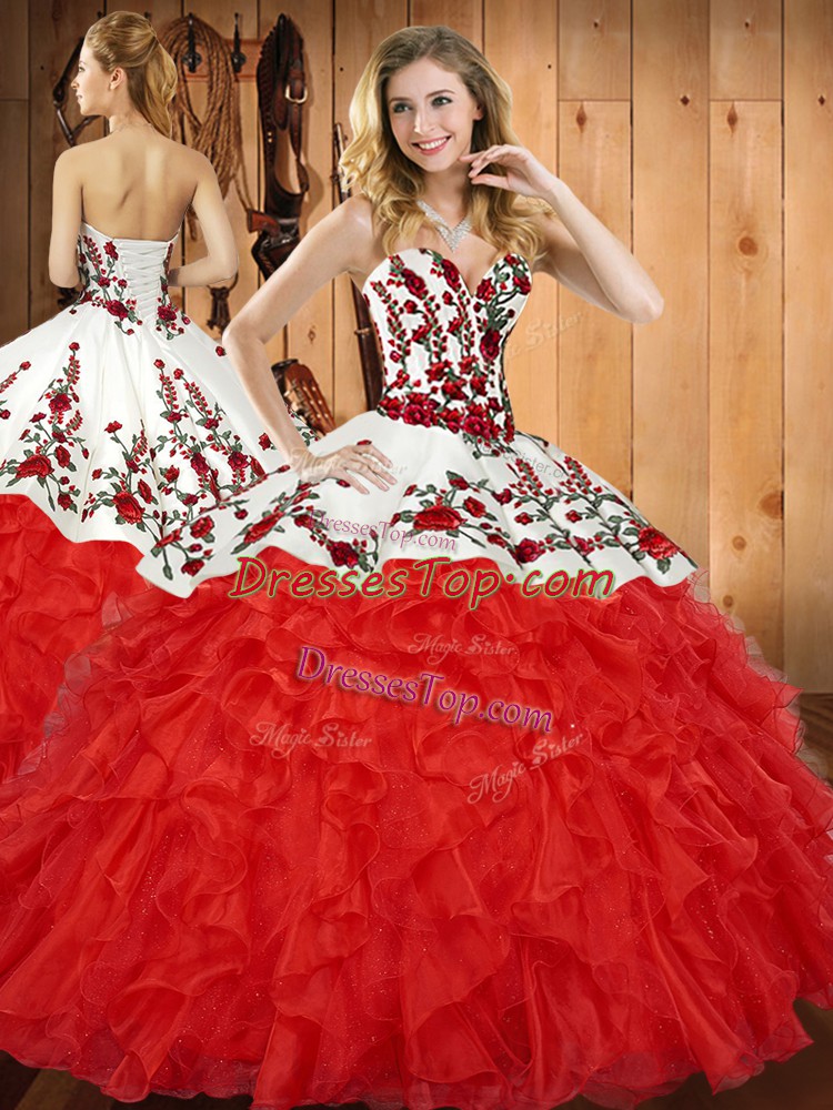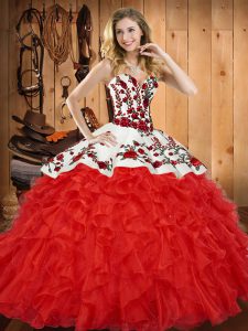 On Sale Satin and Organza Sweetheart Sleeveless Lace Up Embroidery and Ruffles Quince Ball Gowns in Wine Red