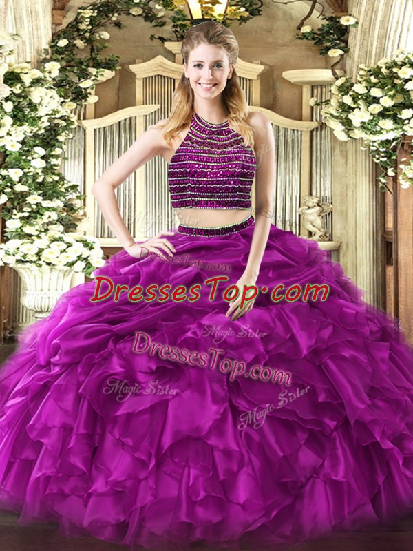 On Sale Sleeveless Floor Length Beading and Ruffles Zipper Vestidos de Quinceanera with Fuchsia