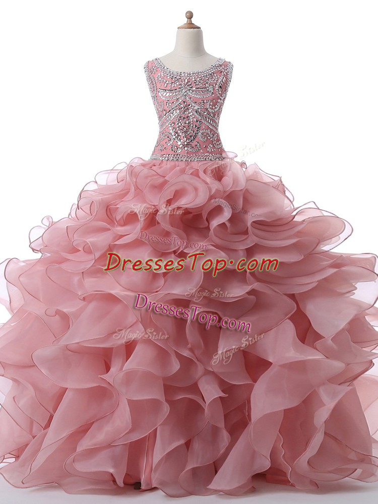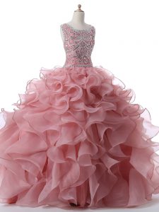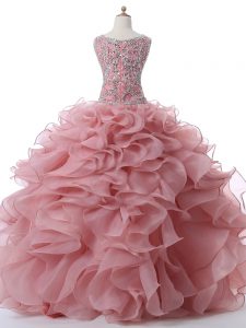 On Sale Sleeveless Organza Floor Length Zipper Sweet 16 Quinceanera Dress in Pink with Beading and Ruffles