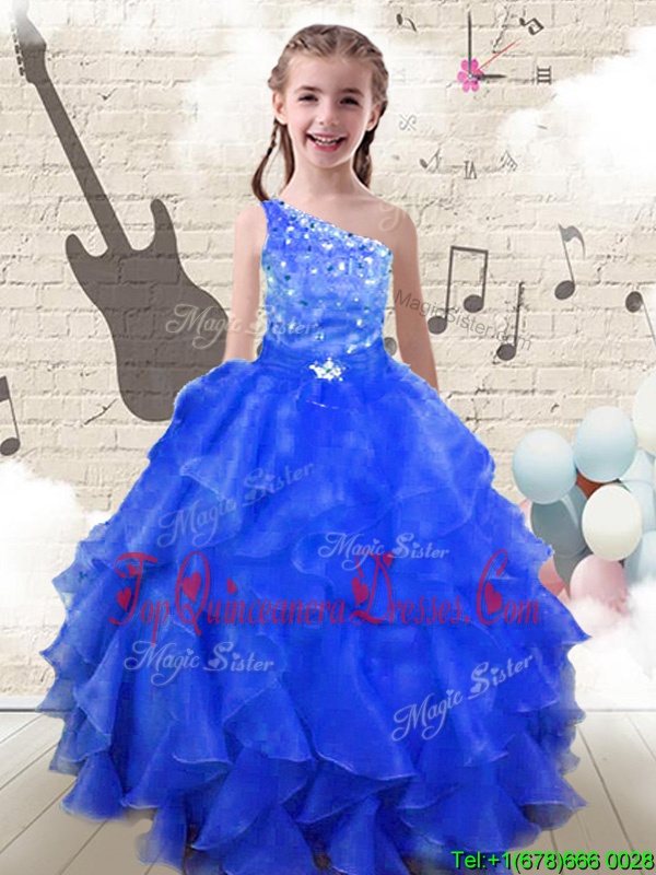 One Shoulder Beading and Ruffles High School Pageant Dress Royal Blue Lace Up Sleeveless Floor Length