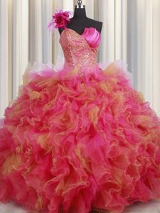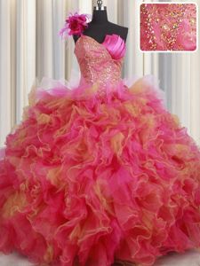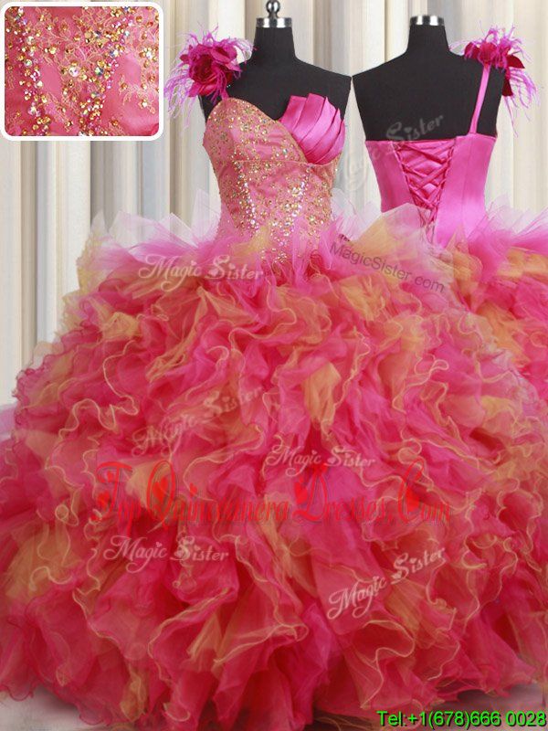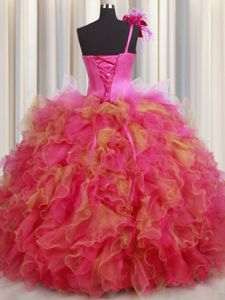 One Shoulder Floor Length Lace Up Ball Gown Prom Dress Multi-color and In for Military Ball and Sweet 16 and Quinceanera with Beading and Ruffles and Hand Made Flower