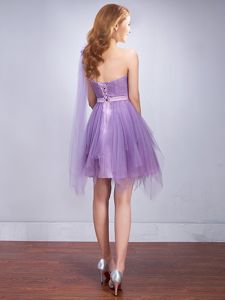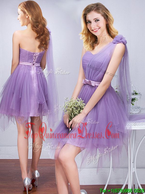 One Shoulder Lavender Sleeveless Mini Length Ruffles and Ruching and Belt and Hand Made Flower Lace Up Quinceanera Dama Dress