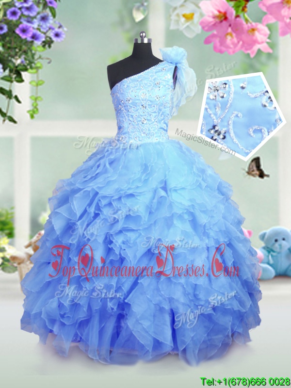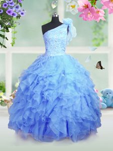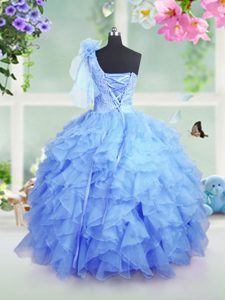 One Shoulder Sleeveless Pageant Dress for Teens Floor Length Beading and Ruffles Baby Blue Organza