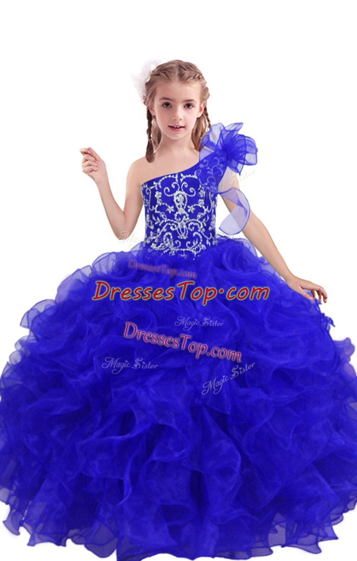One Shoulder Sleeveless Pageant Dress Wholesale Floor Length Beading and Ruffles Royal Blue Organza