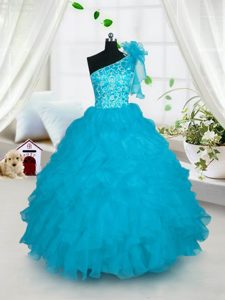 One Shoulder Turquoise Ball Gowns Embroidery and Ruffles Little Girl Pageant Gowns Lace Up Organza Sleeveless Floor Length