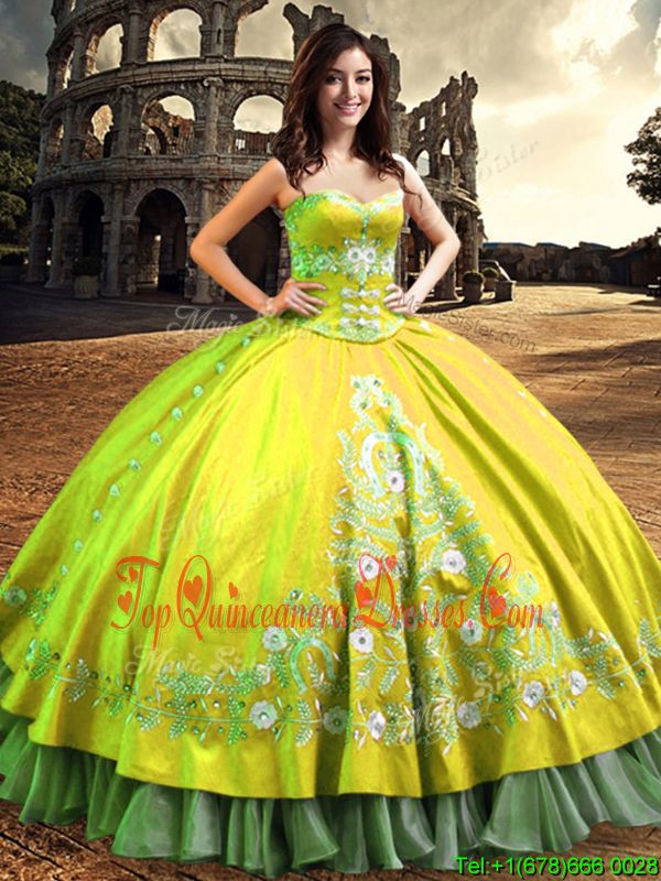 One Shoulder Yellow Green Sleeveless Lace and Embroidery Floor Length Quince Ball Gowns