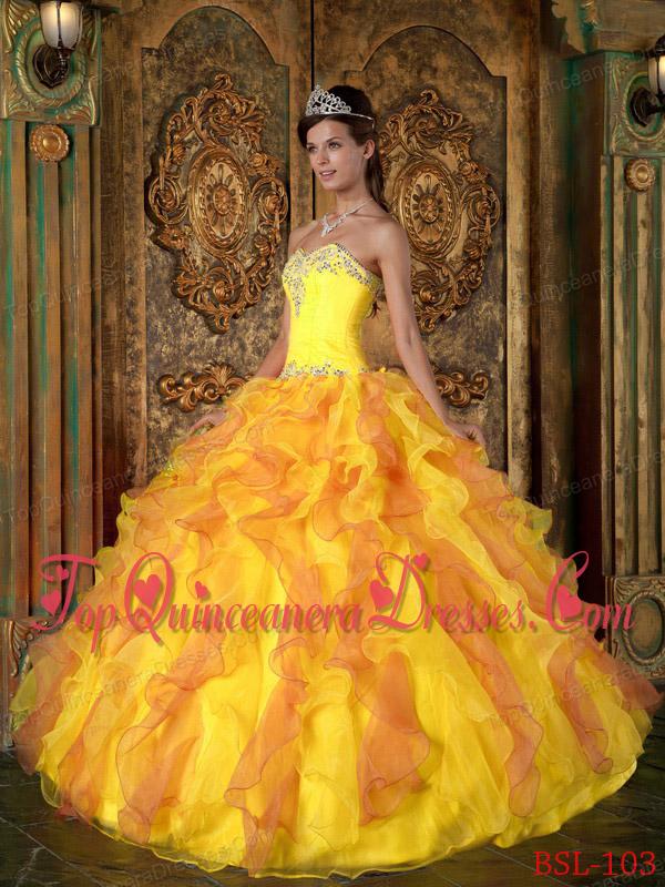 Orange A-Line / Princess Sweetheart Floor-length Ruffles Organza Cheap Quinceanera Dress