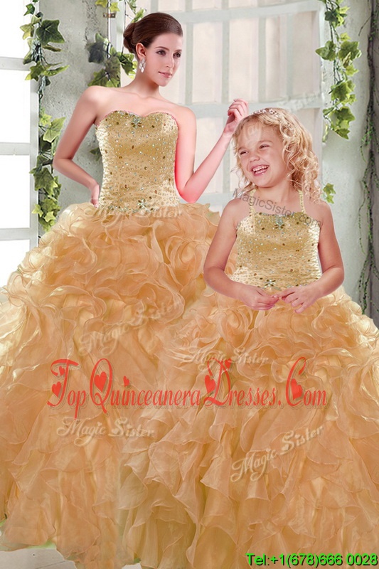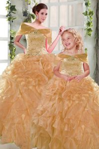 Orange Ball Gowns Organza Strapless Sleeveless Beading and Ruffles Floor Length Lace Up 15th Birthday Dress