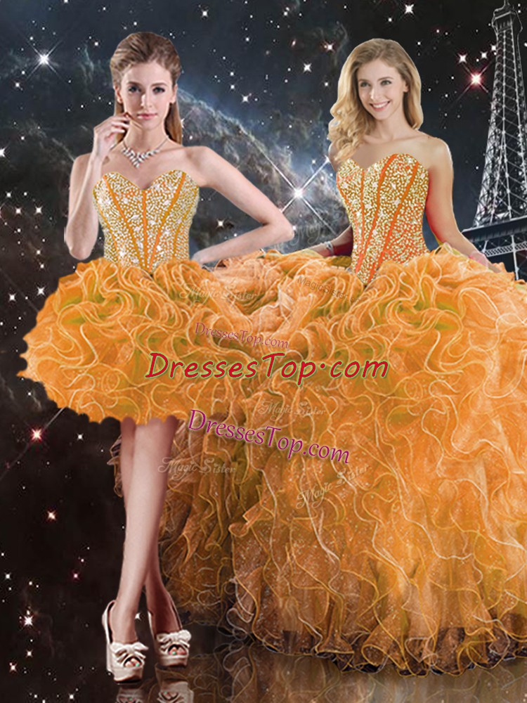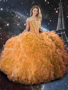 Orange Ball Gowns Sweetheart Sleeveless Organza Floor Length Lace Up Beading and Ruffles 15th Birthday Dress
