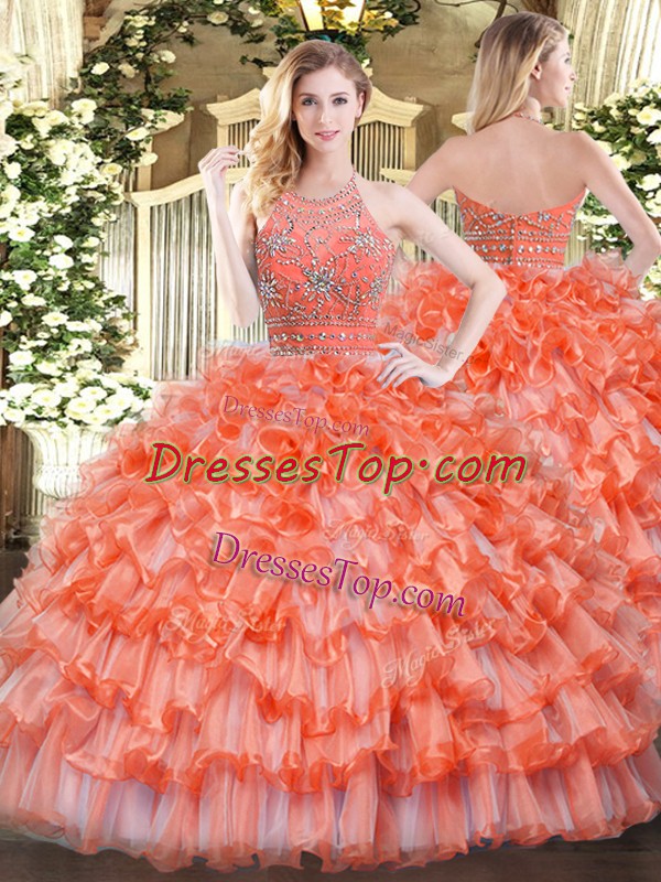 Orange Halter Top Zipper Beading and Ruffled Layers 15 Quinceanera Dress Sleeveless